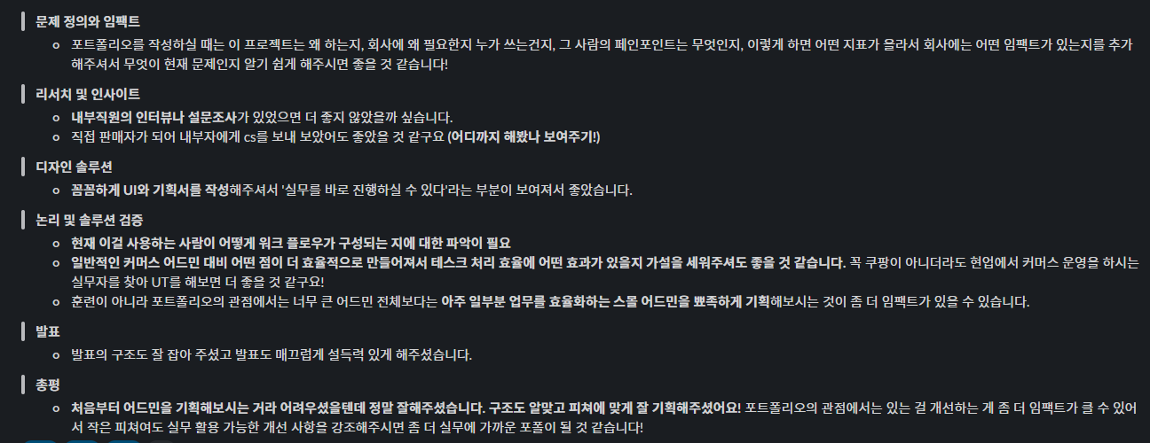 과제를 성실히 이행하는 것도 좋지만 포트폴리오에 들어가야 하는 프로젝트라는 것을 기억하고 문제 정의부터 솔루션까지 논리 흐름을 잊지 않고 설득력 있는 프로젝트로 결과물을 남겨야 함....