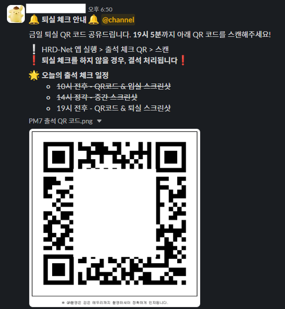 오전 9시 50분, 오후 6시 50분에 입실 / 퇴실 체크 안내를 슬랙으로 해준다.