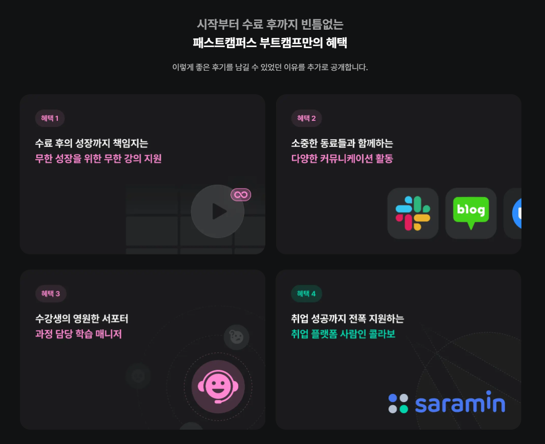 패스트캠퍼스 PM 부트캠프를 통해 프로덕트 매니저라는 직무에 도전한지 벌써 6개월이 지났다!이 글에서는 패스트캠퍼스 PM 부트캠프 7기를 수강하며 느낀 점과 성장한 점을 아래 7가지 질문에 답변하는 형식으로 정리해 보려고 한다. 이 글이 PM 부트캠프에 관심 있는 분들에게 도움이 되기를 바라면서! 1. 왜 다른 부트캠프가 아닌 패스트캠퍼스 부트캠프를 선택했는가? 패스트캠퍼스 PM 부트캠프를 선택한 이유는 이전 작성했던 게시글에서도 말했던 것 같은데일단 가장 큰 이유는 '국비지원' 이 된다는 것이었다.그리고 이미 기획이라는 직무에 관심을 갖기 시작하면서 패스트캠퍼스에서 진행하는 강의 내용에 대해서 흥미가 있는 상태였기도 했다. 한창 교육에 목말라 있을 때 인스타그램에 패캠에서 진행하는 교육 과정에 대한 ..